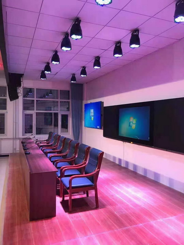 燈光方面,舞臺上方配置了染色燈,面光燈等,以滿足開會,演出等多種使用功能。
